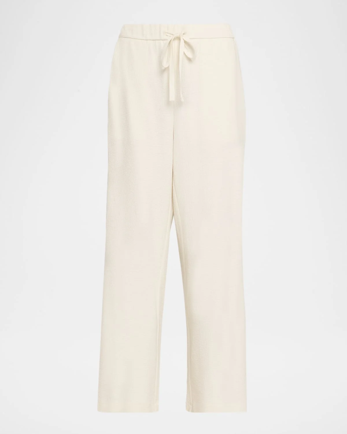 These Eileen Fisher pants are crafted in a cozy doubleknit with a warm waffle exterior and smooth interior Approx. 27" inseam Midrise sits high on the hips Elasticized drawstring waistband Flat front Side slant pockets Cropped at the ankle Straight legs Pullon style Organic cotton/Tencel™ lyocell Machine wash cold Imported