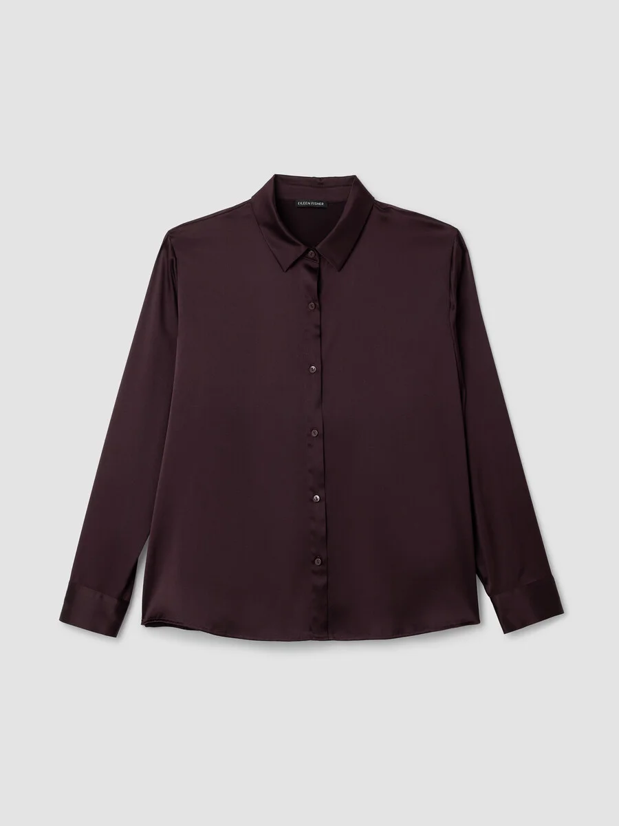 Classic—with a touch of shine. An elegant button-up shirt that goes straight into the wash, in our lustrous silk charmeuse. Made in a Fair Trade Certified™ factory. Style No. F5SM9-T5775 DESIGN - Close at the shoulders, wider at the hem. A silhouette that fits the body with ease. - Size XS measures 25 1/2 inches on the body. Size PS measures 24 1/2 inches on the body. Size 1X measures 28 1/2 inches on the body. - Classic collar, button front and button cuffs with double pleat. - Back yoke with center box pleat; 4-inch side slits. - Mother-of-pearl buttons. - Style No. F5SM9-T5775 FABRIC - Lustrous, satin-woven silk with a touch of stretch for movement. - Made in Vietnam. SUSTAINABILITY - Our Fair Trade Certified™ factories meet rigorous social and environmental standards. By choosing Fair Trade Certified™ products, you’re helping to improve the lives of workers, build resilient communities and protect the environment. - This fabric is bluesign® APPROVED. It's dyed with safer chemistry using less water and less energy, meeting the bluesign® CRITERIA.