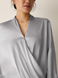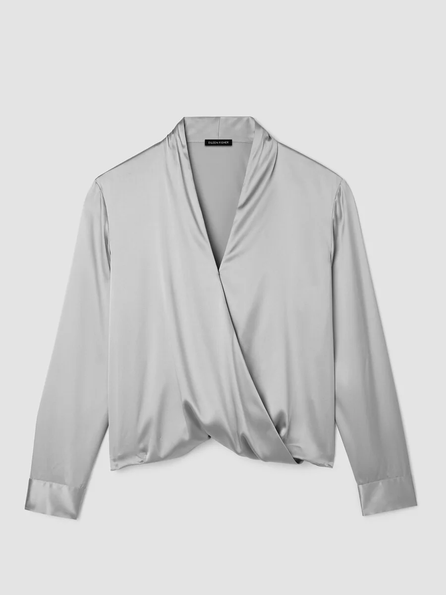 Eye-catching elegance. A wrap-inspired top transformed by the luster of our Stretch Silk Charmeuse. Made in a Fair Trade Certified™ factory. Style No. F5SM2-T6399 DESIGN - Close at the shoulders, wider at the hem. A silhouette that fits the body with ease. - Jisu is 5'9" and wears a size S in Mulled Grape, which measures 24 inches on the body. Size PS measures 22 inches on the body. Size 1X measures 26 1/2 inches on the body. - High collar with wrap-style front, button cuffs with double pleat. - Hook and eye closure at center front crossover. - Mother-of-pearl buttons. - Style No. F5SM2-T6399 FABRIC - Lustrous, satin-woven silk with a touch of stretch for movement. - Hand wash cold. Line dry. - Made in Vietnam. 96% Silk 4% Spandex. SUSTAINABILITY - Our Fair Trade Certified™ factories meet rigorous social and environmental standards. By choosing Fair Trade Certified™ products, you’re helping to improve the lives of workers, build resilient communities and protect the environment. - This fabric is bluesign® APPROVED. It's dyed with safer chemistry using less water and less energy, meeting the bluesign® CRITERIA.