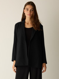 The long blazer. A sophisticated outfit-maker, in soft wool with a touch of stretch. Made in a Fair Trade Certified™ factory. Style No. F5YHH-J5619 DESIGN - Close at the shoulders, wider at the hem. A silhouette that fits the body with ease. - Only available at EILEEN FISHER stores. - Jisu is 5'9" and wears a size XS, which measures 30 1/2 inches on the body. Size 1X measures 32 1/2 inches on the body. - Notch collar, open front, center back seam. - On-seam pockets. - Style No. F5YHH-J5619 FABRIC - Soft, yet structured. A medium-weight weave with a touch of springy texture. - Dry clean only. - Made in Vietnam. 97% Wool/ 3% Elastane. SUSTAINABILITY - Our Fair Trade Certified™ factories meet rigorous social and environmental standards. By choosing Fair Trade Certified™ products, you’re helping to improve the lives of workers, build resilient communities and protect the environment. - Our wool supports ranchers who use better practices for animal welfare and land management.