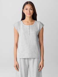 Relaxed and easy. A striped sleep top with a henley button closure, in organic cotton that's grown using regenerative farming practices. Style No. SLWDM-T944 DESIGN - Fits close to the body. Our slim fit is easier than the industry standard—with stretch for maximum comfort. - Only available online. - Size XS measures 24 1/2 inches on the body. Size 1X measures 27 1/2 inches onthe body. - Short sleeves, 4-button henley closure. - River shell buttons. - Finished with banding at the neck. - Style No. SLWDM-T944 FABRIC - Soft and stretchy. Organic cotton jersey in a yarn-dyed stripe. Now grown using regenerative farming methods that focus on soil health and biodiversity. - Machine wash cold. Tumble dry low. - Made in Peru. 100% Organic Cotton. SUSTAINABILITY - Organic farming supports clean water and healthy soil.