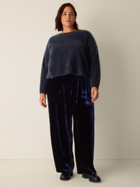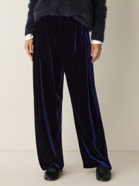 Soft and sophisticated. The pleated straight pant, in our signature velvet with subtle shimmer. Made in a Fair Trade Certified™ factory. Style No. F5VLO-P4874 DESIGN - Straight through the leg. Fits the body with ease. - Bo Boy is 5'9" and wears a size XS in Ink. - 1 1/2-inch elastic waist, 1-inch-deep front pleats. - 11 1/2-inch rise; 28-inch inseam; 10-inch leg opening (size S). 11-inch rise; 26-inch inseam; 9 1/2-leg opening (size PS). 13 1/2-inch rise; 28-inch inseam; 11-inch leg opening (size 1X). - Style No. F5VLO-P4874 FABRIC - Our signature viscose silk velvet, now made in part from pulp derived from recycled cotton. - Machine wash cold. Tumble dry low. Do not dry clean. - Made in Indonesia. 80% Viscose/20% Silk. SUSTAINABILITY - Our Fair Trade Certified™ factories meet rigorous social and environmental standards. By choosing Fair Trade Certified™ products, you’re helping to improve the lives of workers, build resilient communities and protect the environment. - This fabric is bluesign® APPROVED. It's dyed with safer chemistry using less water and less energy, meeting the bluesign® CRITERIA.