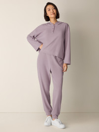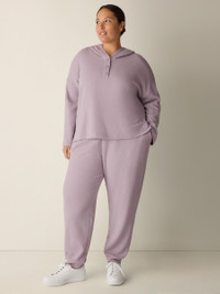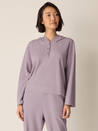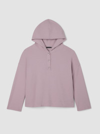 An elevated take on the hoodie. Designed with a henley button closure and bracelet sleeves, in a cozy blend of cotton and Tencel™ Lyocell. Style No. F5WXA-T6423 DESIGN - A generous, boxy fit that drapes away from the body to create movement. - Only available at select EILEEN FISHER stores. - Valerie is 5'9" and wears a size XS in Black, which measures 23 1/2 inches on the body. Size 1X measures 26 inches on the body. - Hood, drop shoulder, bracelet sleeves. - Henley button front with corozo buttons. - 2-inch side slits. - Style No. F5WXA-T6423 FABRIC - A cozy doubleknit with waffle texture on the outside and a smooth surface on the inside. In a soft blend of cotton and Tencel™ Lyocell. - Machine wash cold. Line dry. - Made in Vietnam. 60% Organic Cotton/40% Tencel™ Lyocell. SUSTAINABILITY - Tencel™ Lyocell fiber is made from responsibly harvested trees.