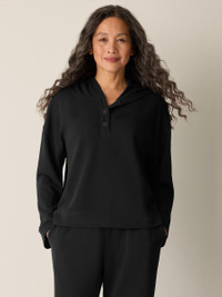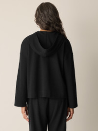 An elevated take on the hoodie. Designed with a henley button closure and bracelet sleeves, in a cozy blend of cotton and Tencel™ Lyocell. Style No. F5WXA-T6423 DESIGN - A generous, boxy fit that drapes away from the body to create movement. - Only available at select EILEEN FISHER stores. - Valerie is 5'9" and wears a size XS in Black, which measures 23 1/2 inches on the body. Size 1X measures 26 inches on the body. - Hood, drop shoulder, bracelet sleeves. - Henley button front with corozo buttons. - 2-inch side slits. - Style No. F5WXA-T6423 FABRIC - A cozy doubleknit with waffle texture on the outside and a smooth surface on the inside. In a soft blend of cotton and Tencel™ Lyocell. - Machine wash cold. Line dry. - Made in Vietnam. 60% Organic Cotton/40% Tencel™ Lyocell. SUSTAINABILITY - Tencel™ Lyocell fiber is made from responsibly harvested trees.