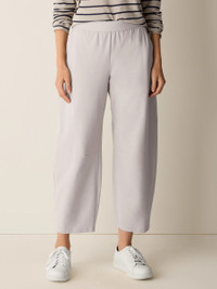 The arch pant. A modern silhouette with a relaxed barrel shape and side seams, in our Washable Stretch Crepe. Style No. S6TKO-P4893 DESIGN - Subtle parallel curves create an arch shape through the leg, slightly tapered at the ankle. - Select colors may vary by store. - Kalyane is 5'10" and wears a size S in Ink. Haejin is 5'5" and wears a size PS. Ryan is 5'8" and wears a size 1X. - 2-inch elastic waistband, slash pockets. - 11-inch rise; 27-inch inseam; 8-inch leg opening (size XS). 11-inch rise; 25-inch inseam; 7 1/2-inch leg opening (size PS). 13-inch rise; 27-inch inseam; 9-inch leg opening (size 1X). - Style No. S6TKO-P4893 FABRIC - From France, a textural knit with a unique combination of sophistication and stretch. Packs beautifully, goes everywhere. Loved since 2002. - Machine wash cold. Tumble dry low. - Made in USA of imported materials. 70% Eco Vera Viscose/24% Recycled Nylon/6% Elastane.