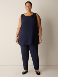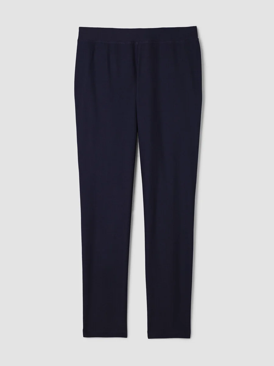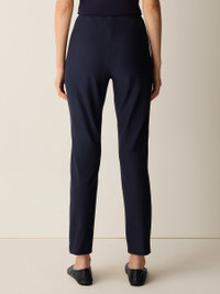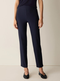 Structured and streamlined, our best-selling slim pant that reinvents layering. In our washable, packable stretch crepe. Style No. S6TKO-P0696 DESIGN - Fits close to the body. Our slim fit is easier than the industry standard—with stretch for maximum comfort. - Martyna is 5'9" and wears a size S in Ink. Haejin is 5'5" and wears a size PS. Ryan is 5'8" and wears a size 1X. - 2-inch yoke waistband, back darts for shape. - 9 1/2-inch rise; 28 1/2-inch inseam; 6 1/2-inch leg opening (size XS). 9 1/2-inch rise; 26-inch inseam; 6-inch leg opening (size PS). 12-inch rise; 28 1/2-inch inseam; 7-inch leg opening (size 1X). - Style No. S6TKO-P0696 FABRIC - From France, a textural knit with a unique combination of sophistication and stretch. Packs beautifully, goes everywhere. Loved since 2002. - Machine wash cold. Tumble dry low. - Made in USA of imported materials. 70% Eco Vera Viscose/24% Recycled Nylon/6% Elastane.