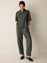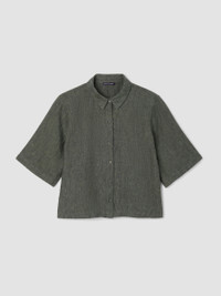 Our quintessential warm-weather shirt with a classic collar and elbow sleeves. Delave dyed for nuanced color—pair it with our matching pant to make it a set. Style No. S6LOL-T6450 DESIGN - Close at the shoulders, wider at the hem. A silhouette that fits the body with ease. - Only available at select EILEEN FISHER stores. - Kalyane is 5'10" and wears a size S in Bayleaf, which measures 22 inches on the body. Size 1X measures 24 1/2 inches on the body. - Classic collar, button front, elbow sleeves. - Inverted back box pleat. - Style No. S6LOL-T6450 FABRIC - Crisp, textural linen with the nuanced color that comes from delave dyeing. Each garment is unique. - Machine wash cold. Tumble dry low. - Made in Indonesia. 100% Organic Linen. SUSTAINABILITY - Our Fair Trade Certified™ factories meet rigorous social and environmental standards. By choosing Fair Trade Certified™ products, you’re helping to improve the lives of workers, build resilient communities and protect the environment. - This fabric is bluesign® APPROVED. It's dyed with safer chemistry using less water and less energy, meeting the bluesign® CRITERIA. - Organic farming supports clean water and healthy soil.