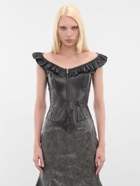 Black leather vest with frilled collar embellishment, angled hem, and raw edge detailing. Featuring: • Slim fit • Leather construction • Wide neckline with frilled embellishment at collar • Sleeveless cut with armholes • Front two-way zip closure • Raw hems with angled finish • Standard sizing Model is 5'9" wearing size S. Bust: 32" Waist: 25" Hips: 34"