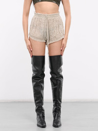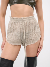 ELENA VELEZ shorts in natural, bloomer design, paneled cotton gauze construction, semi-sheer, shirring throughout, adjustable drawstring waist, raw hems, mini-length, relaxed fit. Made in NYC Standard Sizing Model is 5'8" wearing size XS. Bust: 32" Waist: 26" Hips: 34.5"