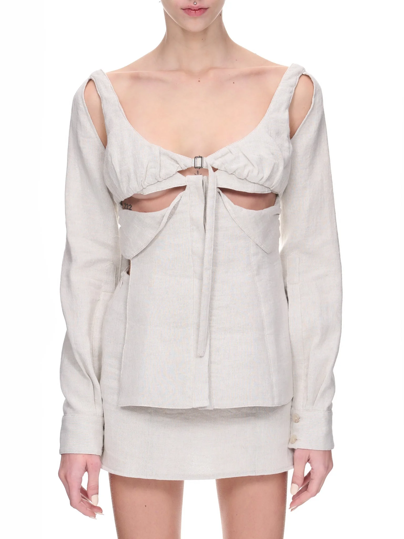 ELENA VELEZ top in beige, cotton gauze, deep plunging neckline, center gathering design, cut-out details, adjustable pull tab, cinching bust, hidden placket button closure, long sleeves, relaxed fit. Made in NYC Standard Sizing 100% Cotton Model is 5'9" 5wearing size S. Bust: 33" Waist: 24" Hip: 33"