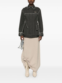 darted denim jacket Highlights - Charcoal grey - Cotton blend - Denim - Dart detailing - Fully pleated - Concealed front press-stud fastening - Frayed detailing - Exposed-seam detailing - Stand-up collar - D-ring findings - Long sleeves - Belted cuffs - Adjustable side straps - Two side inset pockets - Unlined - Straight hem Made in United States Composition Cotton 97%, Spandex/Elastane 3% SIZE & FIT Model measurements Height 5 ft 11 in(1.8 m) Bust/Chest 32.67 in(83 cm) Hips 36.22 in(92 cm) Waist 24.4 in(62 cm) FittingInformation Designed for a slim fit that sits just away from the body offering a close yet comfortable fit The adjustable tabs allow for fitted preferences Made from a midweight fabric