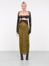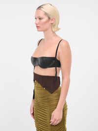 ELENA VELEZ black & brown bra, deconstructed design, vegan leather construction, low straight neckline, spaghetti straps, two back hook & eyes closures, draping straps, attached deconstructed hem, asymmetric hemline, fitted. Made in NYC Standard Sizing Model is 5'9" wearing size S. Bust: 32" Waist: 24" Hips: 34"