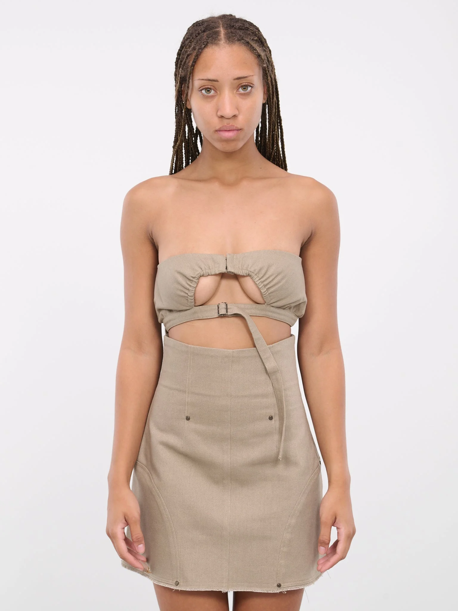 ELENA VELEZ beige bra, denim construction, straight neckline, strapless, front hook & eye closure, cinched strap, front cut-out, gathering, fitted. Made in NYC 100% Cotton Standard Sizing Model is 5'10" wearing size XS. Bust: 32" Waist: 24" Hips: 33"