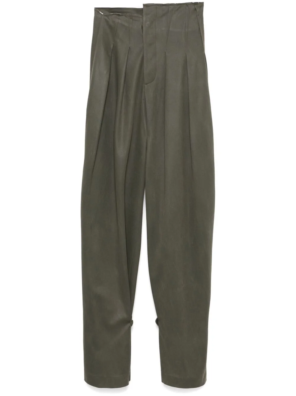 faux-suede trousers Highlights - Khaki - Faux suede - Off-centre front button fastening - Button fly fastening - Pleat detailing - Two side slit pockets - Buttoned cuffs - Straight hem - Long length - Wide leg Made in United States Composition Polyurethane 100% SIZE & FIT Model measurements Height 5 ft 11 in(1.8 m) Bust/Chest 31.49 in(80 cm) Hips 36.61 in(93 cm) Waist 24.4 in(62 cm) FittingInformation Designed with a wide-leg cut, these trousers allow for a close fit at the waist and offer a loose and roomy fit over the leg The adjustable tabs allow for fitted preferences Made from a midweight non-stretch fabric, this piece offers minimal elasticity when worn