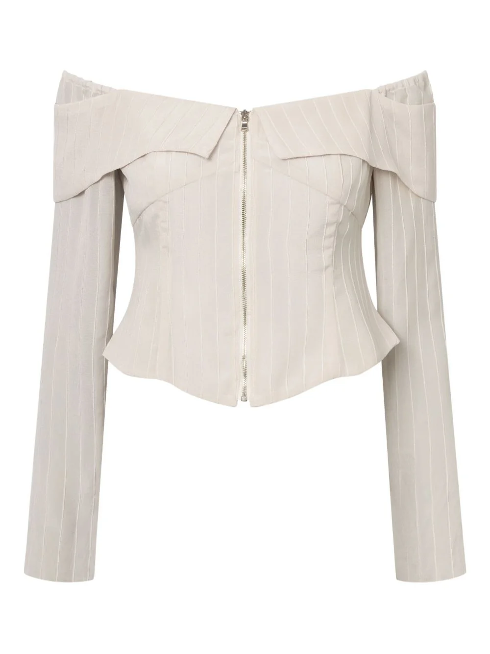 off-shoulder zip-front blouse Highlights Made in United States Composition Polyester 100%