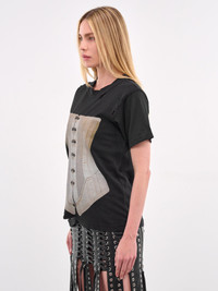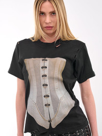 ELENA VELEZ x ONLYFANS t-shirt in black, paneled construction, trompe l'oeil corset graphic print, distressing, ribbed crewneck, short sleeves, straight hem, relaxed fit. Standard Sizing Model is 5'8" wearing size S. Bust: 32" Waist: 24" Hips: 35"