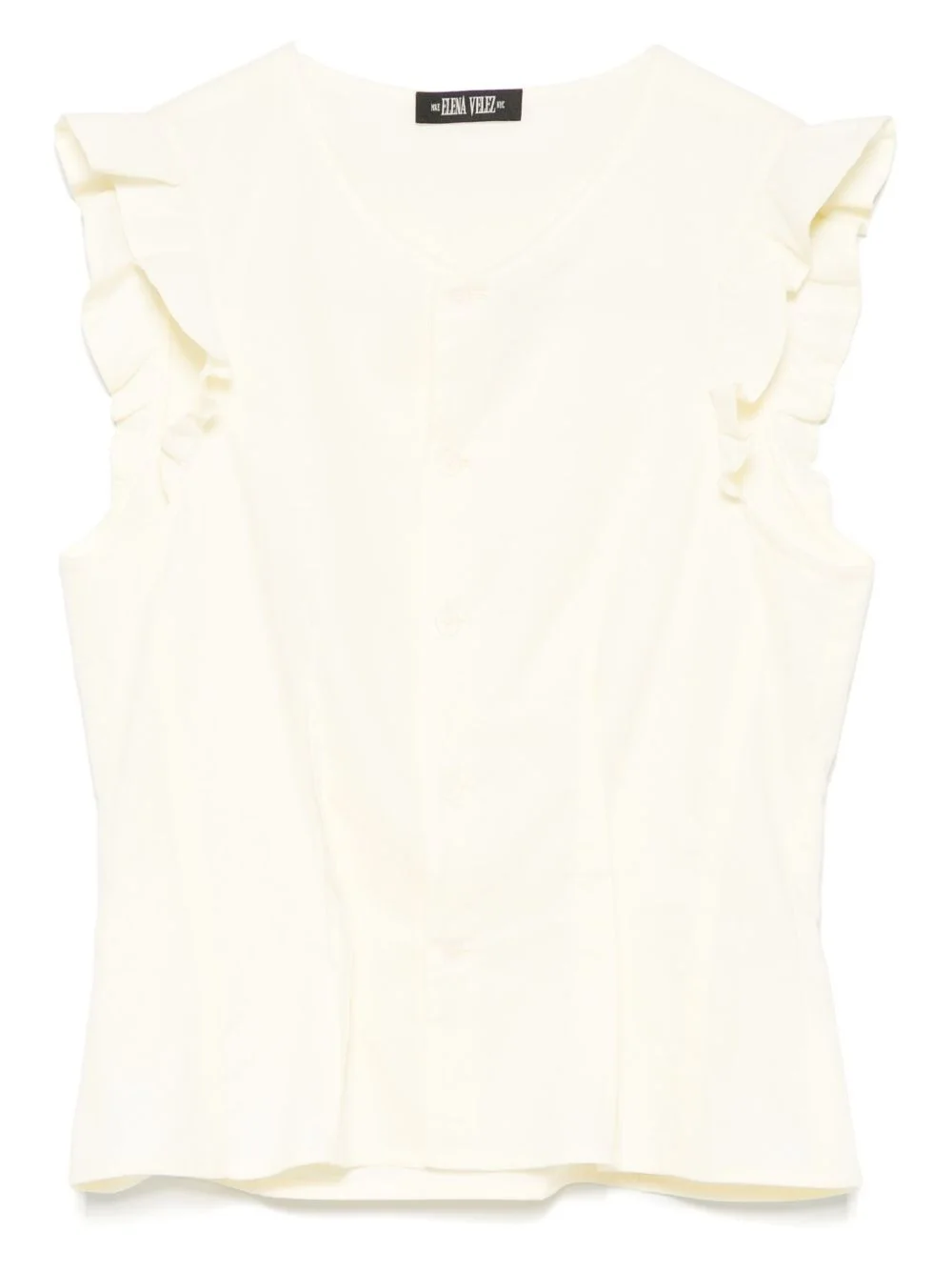 Prairie top Highlights - Butter yellow - Front button fastening - Crew neck - Short sleeves - Ruffled detailing Made in United States Composition Cotton 100% SIZE & FIT Model measurements Height 5 ft 10 in(1.78 m) Bust/Chest 33.46 in(85 cm) Hips 36.22 in(92 cm) Waist 23.22 in(59 cm) FittingInformation Designed for a slim fit that sits just away from the body offering a close yet comfortable fit Made from a lightweight non-stretch fabric