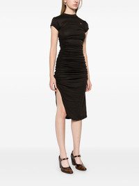 ruched mini dress Highlights - Black - Knitted construction - Ruched bodice - Crew neck - Short sleeves - Draped detailing - Unlined - Curved hem - Mid-length Made in United States Composition Polyester 70%, Rayon 30% SIZE & FIT Model measurements Height 5 ft 9 in(1.75 m) Bust/Chest 31.88 in(81 cm) Hips 34.64 in(88 cm) Waist 24.01 in(61 cm) FittingInformation Designed for a close fit throughout Made from a midweight non-stretch fabric, this piece offers minimal elasticity when worn