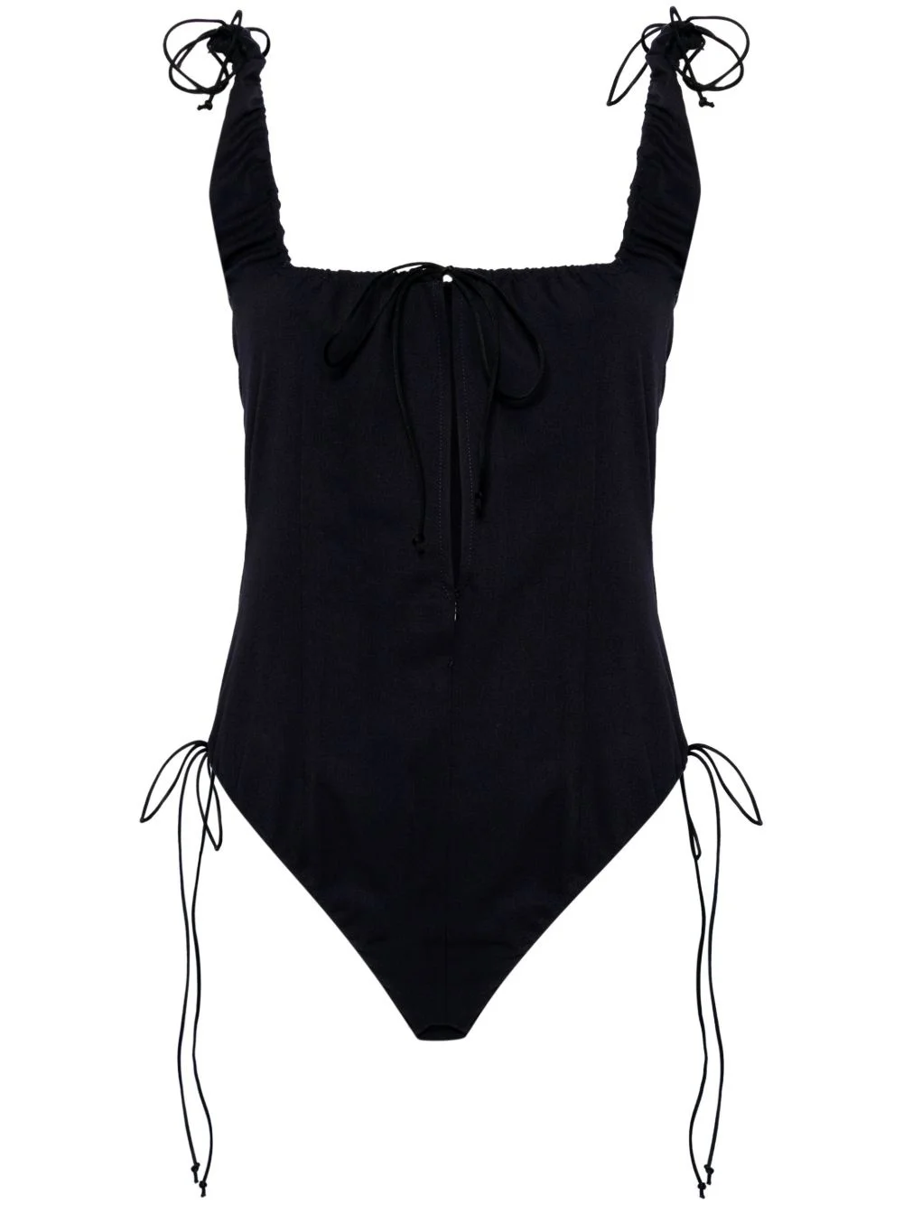 scoop-neck sleeveless body Highlights - Navy blue - Jersey texture - Scoop neck - Tie-fastening straps - Rear tie fastening - Keyhole detail to the rear - Sleeveless - High cut with side-tie fastening Made in United States Composition Nylon 73%, Rayon 17%, Wool 7%, Spandex/Elastane 3% SIZE & FIT Model measurements Height 5 ft 11 in(1.8 m) Bust/Chest 33.07 in(84 cm) Hips 37.4 in(95 cm) Waist 25.19 in(64 cm) FittingInformation Designed for a slim fit that sits just away from the body offering a close yet comfortable fit The adjustable drawstring means that you can adjust this piece’s fit to suit your comfort and preference Made from a midweight stretch fabric, this piece offers elasticity and flexibility when worn This piece fits true to size – take your usual size