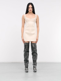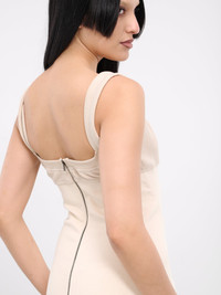 ELENA VELEZ dress in beige, paneled denim & jersey construction, waffle knit, scoop neck, shoulder straps, sleeveless, armscyes, back exposed zip closure, mixed panel detailing, straight hem, mini-length, slim fit. Made in NYC US Sizing Model is 5'8" wearing size 2. Bust: 32" Waist: 26" Hips: 34.5"