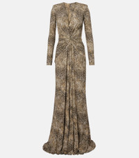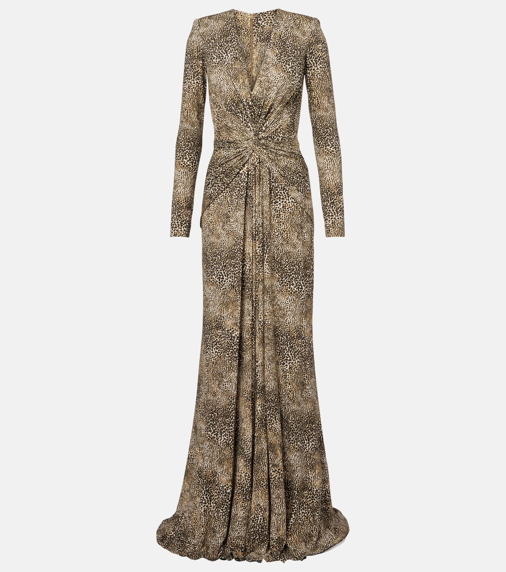 The Animalier jersey gown from Elie Saab features a draped front with a flattering deep V-neckline. The design's long sleeve silhouette is complemented by a floor-length skirt, front slit, and all-over animal-inspired print. Product Details - Material: 93% viscose, 7% elastane - Care instructions: dry clean - Made in Lebanon - Designer color name: Micro Animalier - Item color: brown - Closure: concealed zipper - Item number: P01026808 Size & Fit - True to size - Shoulder pad inserts - Cinched waist - Stretchy fabric - The model seen in the picture is 178cm-5'10" and wearing a size FR 36