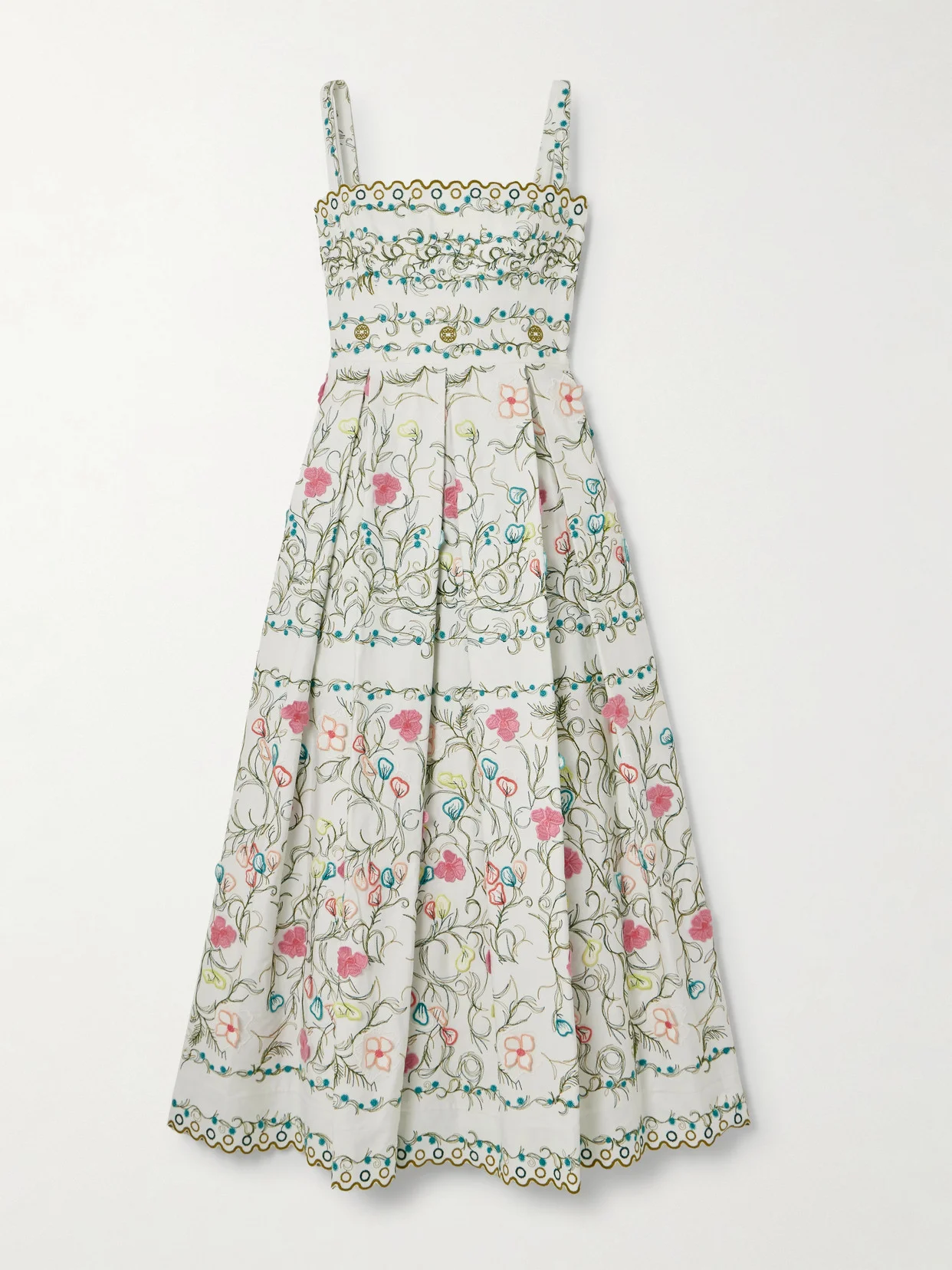 Appliquéd Embroidered Pleated Cotton-blend Twill Midi Dress