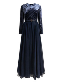 belted dress Highlights - Dark blue - Long sleeves - Belted waist Imported Composition Silk 75%, Viscose 25% Washing instructions Read Manufacturer Guidelines