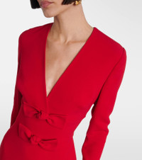 Elie Saab’s impactful designs are proof that the right outfit can make a special occasion all the more memorable. This precious cady gown features a fluid, streamlined silhouette, accented with delicate bows below a deep V-neckline. Product Details - Material: 44% silk, 30% viscose, 24% acetate, 2% elastane - Care instructions: dry clean - Made in Lebanon - Designer color name: Red - Item color: red - Lining: 100% silk - Collar: V-neck - Closure: concealed zipped back - Item number: P01103889 Size & Fit - True to size - Fitted - Non-stretchy fabric - The model seen in the picture is 178cm-5'10" and wearing a size FR 36