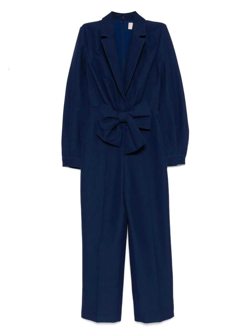 bow-detail jumpsuit Highlights - Empire blue - Concealed rear hook and zip fastening - Two side inset pockets - Buttoned cuffs Made in Italy Composition Organic Cotton 61%, Viscose 39% SIZE & FIT Model measurements Height 5 ft 10 in(1.78 m) Bust/Chest 29.92 in(76 cm) Hips 34.64 in(88 cm) Waist 24.8 in(63 cm) FittingInformation Designed for a slim fit that sits just away from the body offering a close yet comfortable fit Made from a midweight non-stretch fabric Washing instructions Dry Clean Only