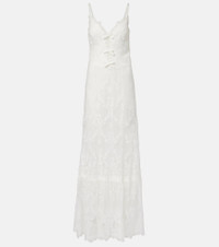 This Elie Saab floral maxi dress is crafted from cotton-blend and showcases delicate floral lace embroidery. The fitting silhouette flows into a graceful skirt, creating a look of effortless allure and features ribbon accents. Product Details - Material: 55% cotton, 24% polyamide, 21% silk - Care instructions: dry clean - Made in Lebanon - Designer color name: White - Item color: white - Lining: 100% silk - Item number: P01045469 Size & Fit - True to size - Low back - Cinched waist - Non-stretchy fabric - The model seen in the picture is 178cm-5'10" and wearing a size FR 36
