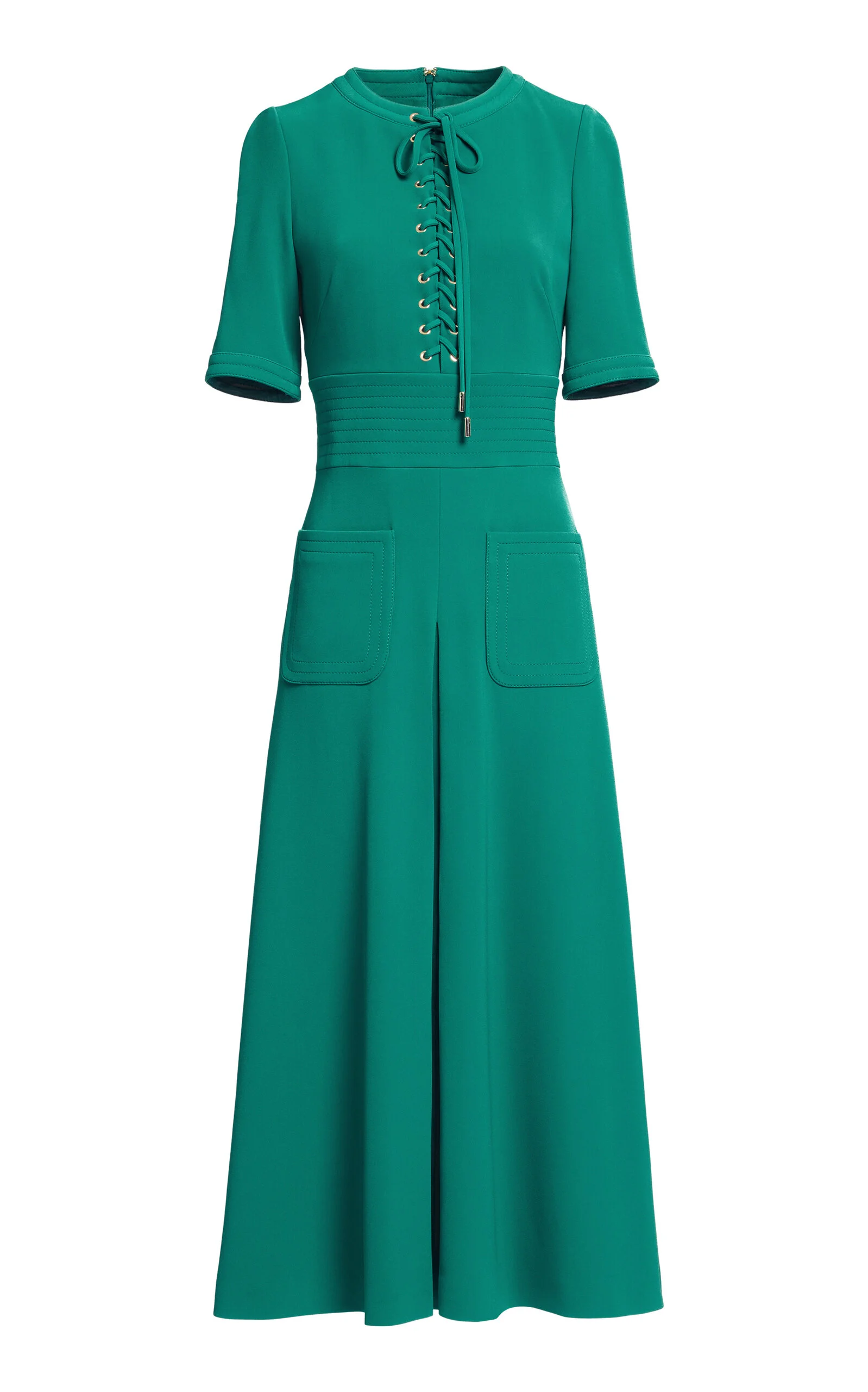 PRODUCT DETAILS - Short sleeve, lace-up detail, A-line, midi hem - Tie fastening - Composition: Cady - Color: Absinthe Green - Dry clean only - Pre-Fall '25