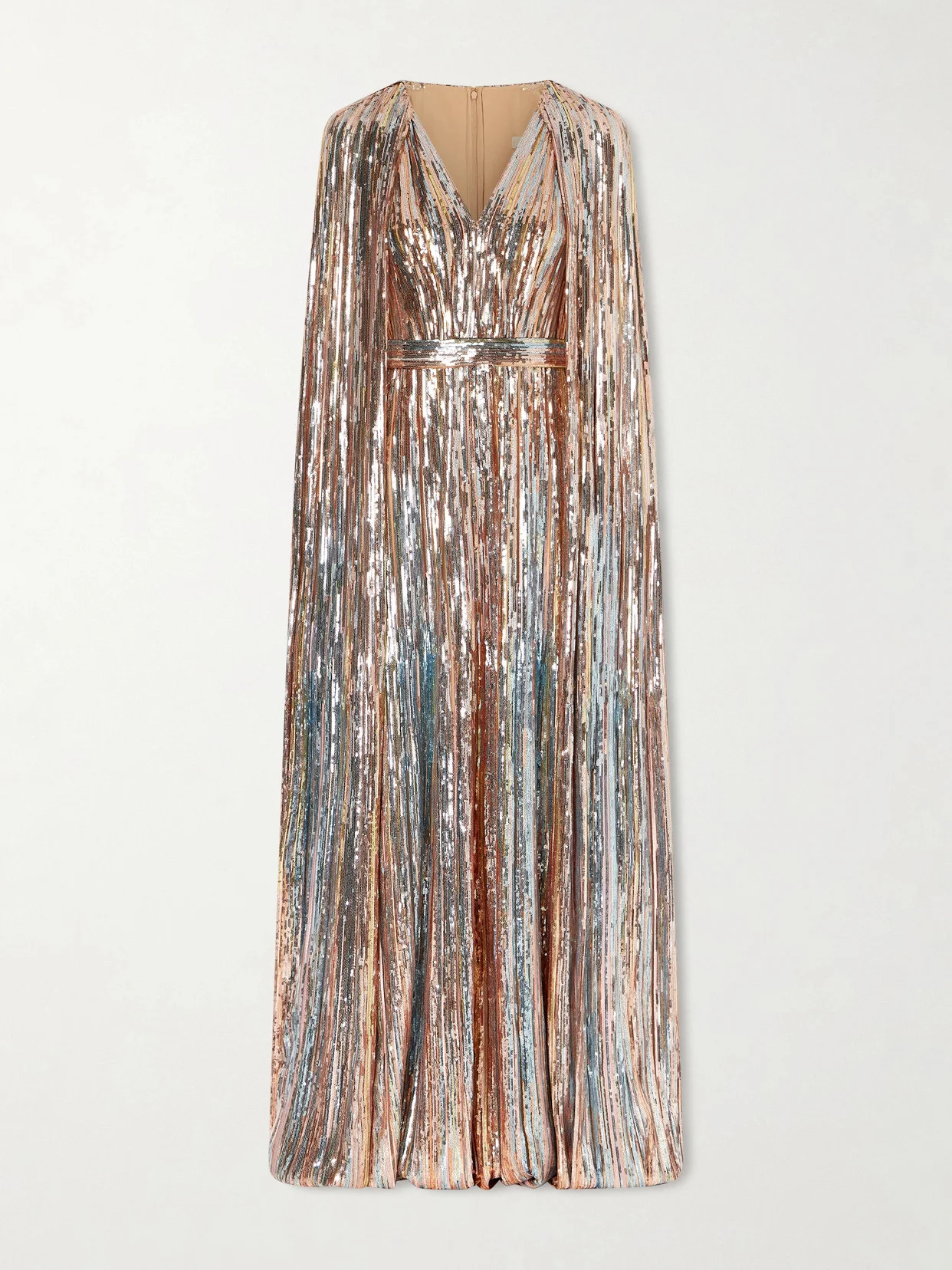 Elie Saab's gown is a shimmering sensation. Made from tulle, it's drenched in a sea of mermaid-like sequins that sweep down the bodice and cape in a striped formation. The V-neckline leaves space for a diamond necklace.