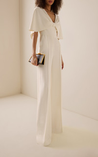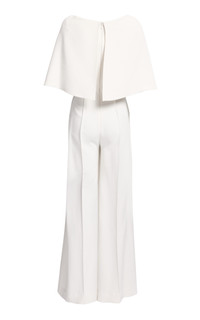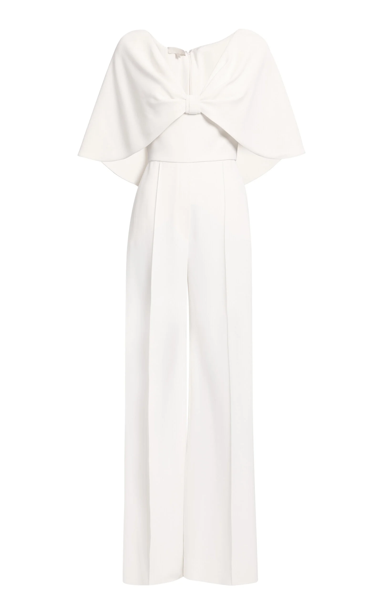 PRODUCT DETAILS - Cape-like sleeve, gathered bust, flared leg - Concealed zip fastening - Composition: Cady - Color: Powder White - Dry clean only - Pre-Fall '25