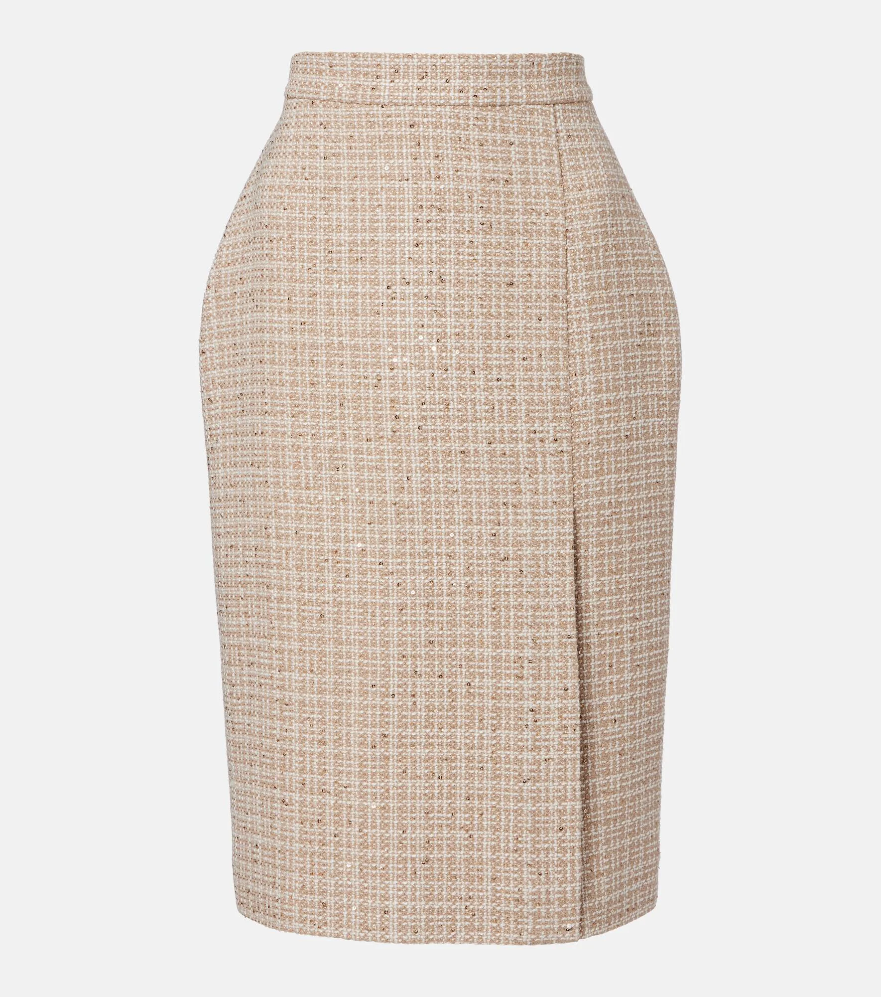Elie Saab’s impactful designs are proof that the right outfit can make a special occasion all the more memorable. This tweed midi skirt showcases a checked pattern and is finished with shimmering sequins. Product Details - Material: 45% silk, 22% polyester, 17% acetate, 16% polyacrylic - Care instructions: dry clean - Made in Lebanon - Color: beige - Designer color name: Brown Sugar - Lining: 100% silk - Closure: zipped back - Item number: P01127500 Size & Fit - True to size - Non-stretchy fabric - High-waisted - The model seen in the picture is 178cm-5'10" and wearing a size FR 36
