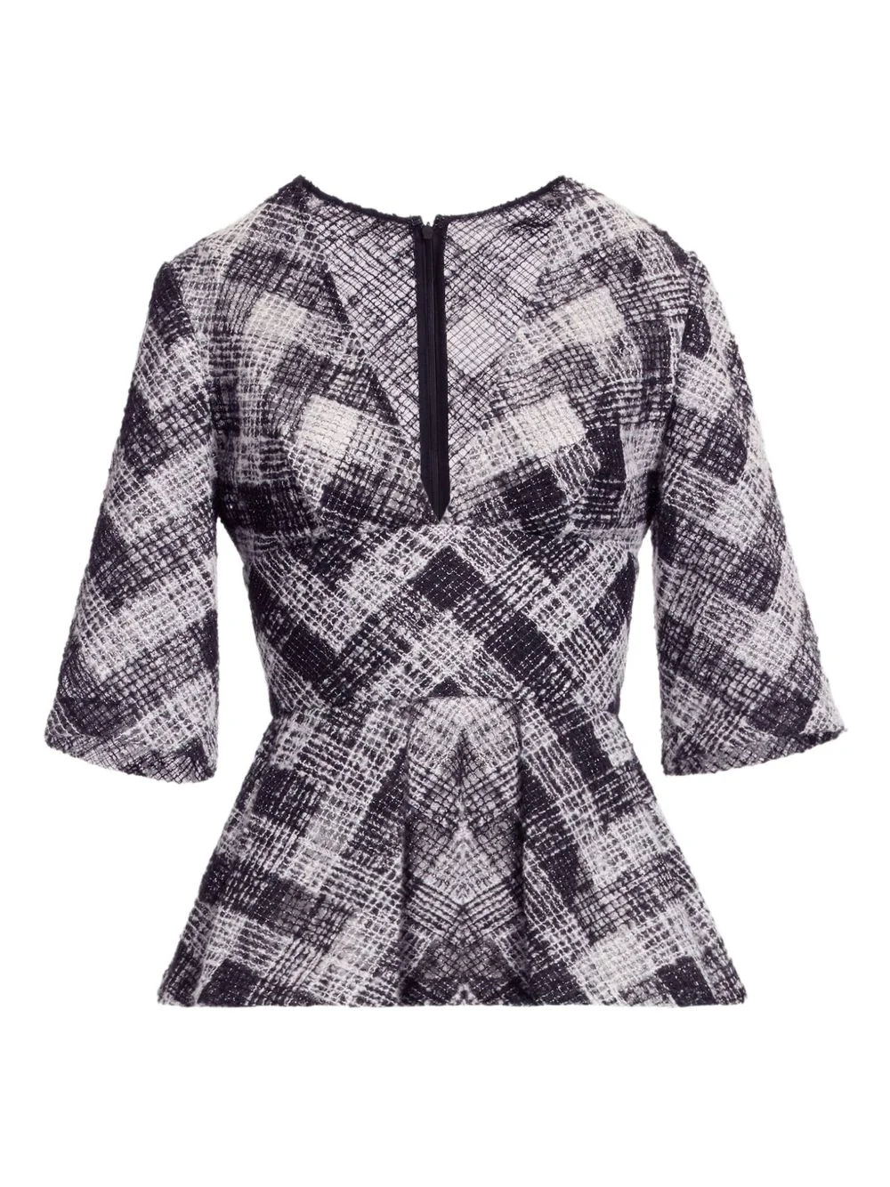chevron peplum blouse Highlights - Black/white - Chevron pattern - V-neck - Short sleeves - Peplum waist - Zip fastening Imported Composition Polyamide 65%, Silk 24%, Mohair 11% Washing instructions Read Manufacturer Guidelines