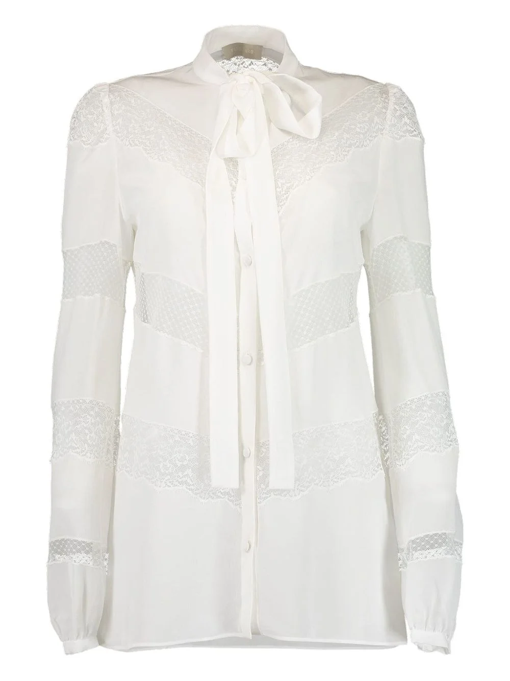 lace-insert crepe shirt Highlights - Optic white - Lace inserts - Button front - Long sleeves - Tied neck Made in Italy Composition Viscose 97%, Elastane 3% Washing instructions Read Manufacturer Guidelines