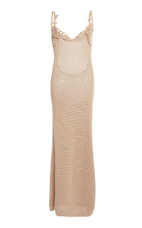 Effervescence, opulent textures, and a fierce feminine energy take hold of the Lebanese talent this season with bold reinterpretations of his fairytale gowns. It's a wildly glamorous lesson in precise, couture-level craftsmanship. Transforming a beach staple into a standalone piece, the label fashions this streamlined maxi dress from open-weave crochet. Floral embroidery follows the neckline and shoulder straps, disappearing as the dress falls closely through the frame. Continue the seaside theme with a raffia handbag and simple sandals. PRODUCT DETAILS - Spring/Summer ‘25 - Slip on - Composition: 76% cotton, 24% polyamide - Dry clean - Designer color: Sand Gazelle - Made in