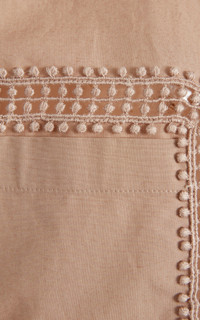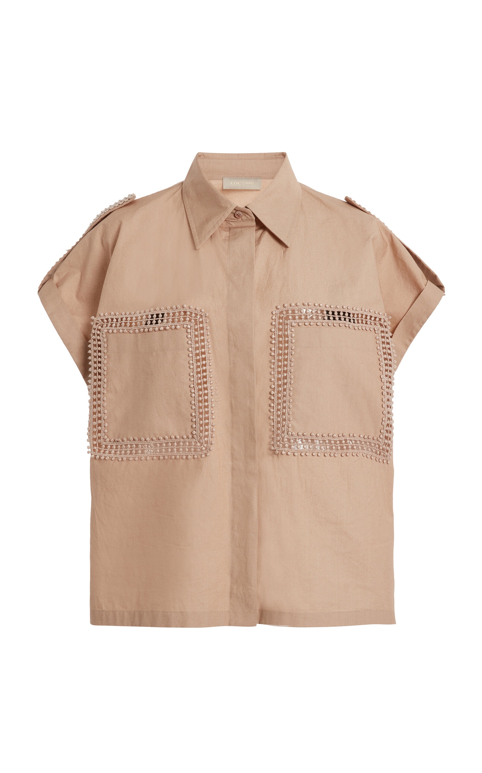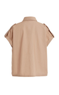 PRODUCT DETAILS - Loose fit, collared, two chest pockets with cutout details, short sleeves - Front Button Closure - Unlined - Composition: Poplin - Color: khaki - Dry Clean Only - Spring '25