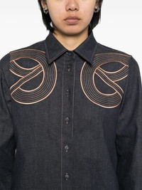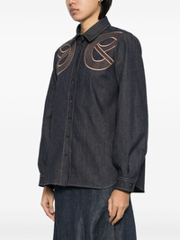 denim shirt Highlights - Blue denim - Cotton blend - Denim - Front button fastening - Classic collar - Long sleeves - Buttoned cuffs - Embroidered graphic to the front - Curved hem Made in Italy Composition Cotton 89%, Linen/Flax 9%, Elastane 2% SIZE & FIT Model measurements Height 5 ft 10 in(1.77 m) Bust/Chest 31.49 in(80 cm) Hips 35.43 in(90 cm) Waist 25.19 in(64 cm) FittingInformation Designed for a slim fit that sits just away from the body offering a close yet comfortable fit Constructed from stretch denim, this piece offers a stretch fit with durability