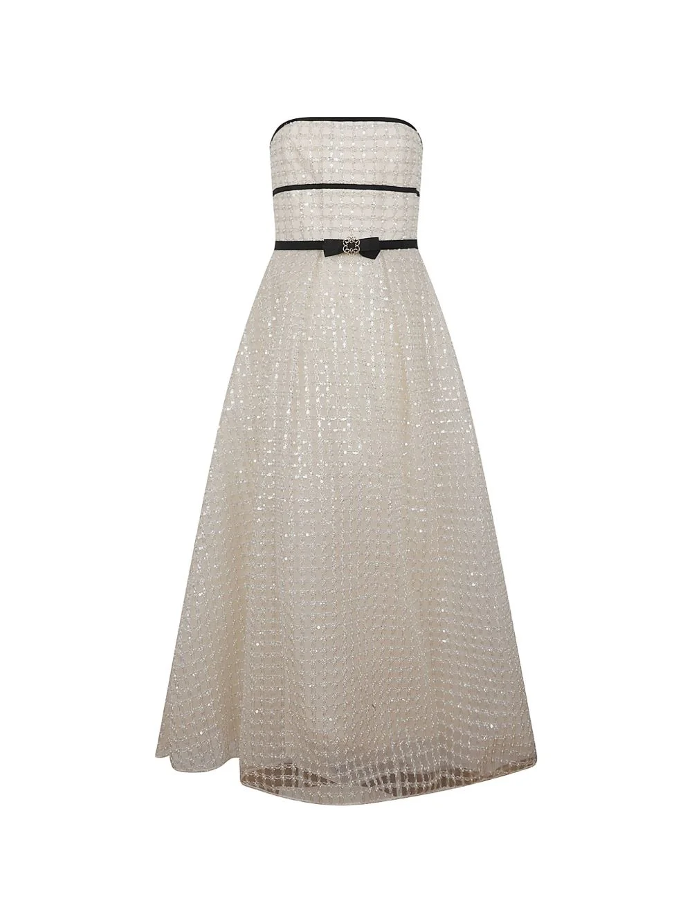 bow belted strapless dress Highlights - White - Bead embellishment - Bow - Black trim - Strapless - Back zip fastening Imported Composition Fabric 100%