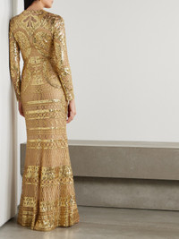 Elie Saab's enchanting Spring '25 collection is an homage to the African savannah and the spirit of adventure. Debuted on the runway, this gown is made from intricately embroidered tulle and embellished with scores of sequins. The partial lining tempers the sheerness.