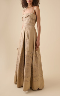 Effervescence, opulent textures, and a fierce feminine energy take hold of the Lebanese talent this season with bold reinterpretations of his fairytale gowns. It's a wildly glamorous lesson in precise, couture-level craftsmanship. This maxi’s cotton-blend base proves the perfect canvas for the label’s personalised embroidery, which makes its way through the fitted bodice and pleated full skirt. The neutral palate coordinates well with tonal leather and raffia accessories. PRODUCT DETAILS - Spring/Summer ‘25 - Concealed zip fastening - Composition: 52% cotton, 48% polyester - Dry clean - Designer color: Elephant Grey - Made in Lebanon