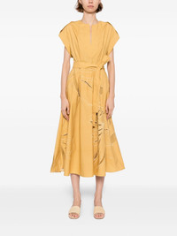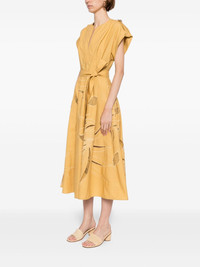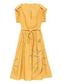 embroidered midi dress Highlights - Sand - Concealed rear hook and zip fastening - V-neck - Short sleeves - Detachable wrist strap Imported Composition Organic Cotton 100% SIZE & FIT Model measurements Height 5 ft 10 in(1.78 m) Bust/Chest 29.92 in(76 cm) Hips 34.64 in(88 cm) Waist 24.8 in(63 cm) FittingInformation Designed for a close fit at the chest with a loose fit over the waist and hips The adjustable tie waist gives a more adaptable and personalised fit Made from a midweight non-stretch fabric Washing instructions Dry Clean Only