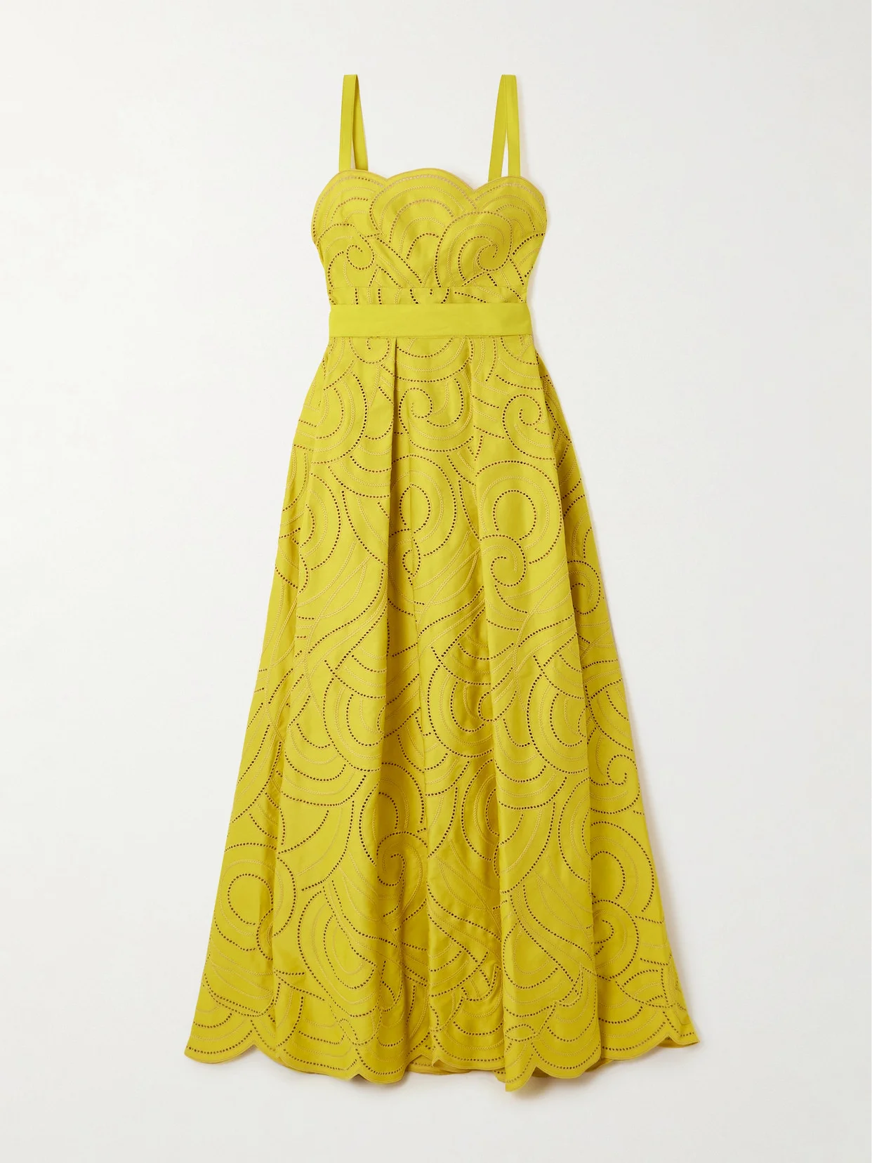 Bold, ornamental style is Elie Saab's forte. This gown is cut from cotton-blend twill that's intricately embroidered. It's belted to define your shape and pleated for enhanced movement through the scalloped skirt. Highlight the elegant square neckline with dainty chains. Large to size. See Size & Fit notes.
