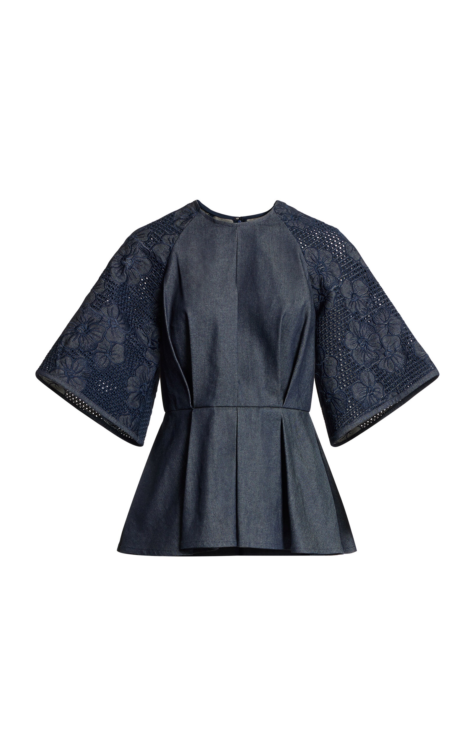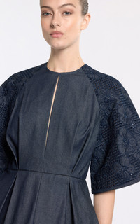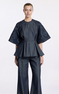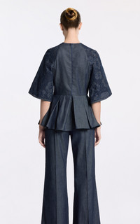 PRODUCT DETAILS - Resort '25 - Short boxy sleeves, keyhole slit, peplum hem - Unlined - Composition: Embroidered Denim - Color: blue - Concealed zip fastening along back - Made in Lebanon