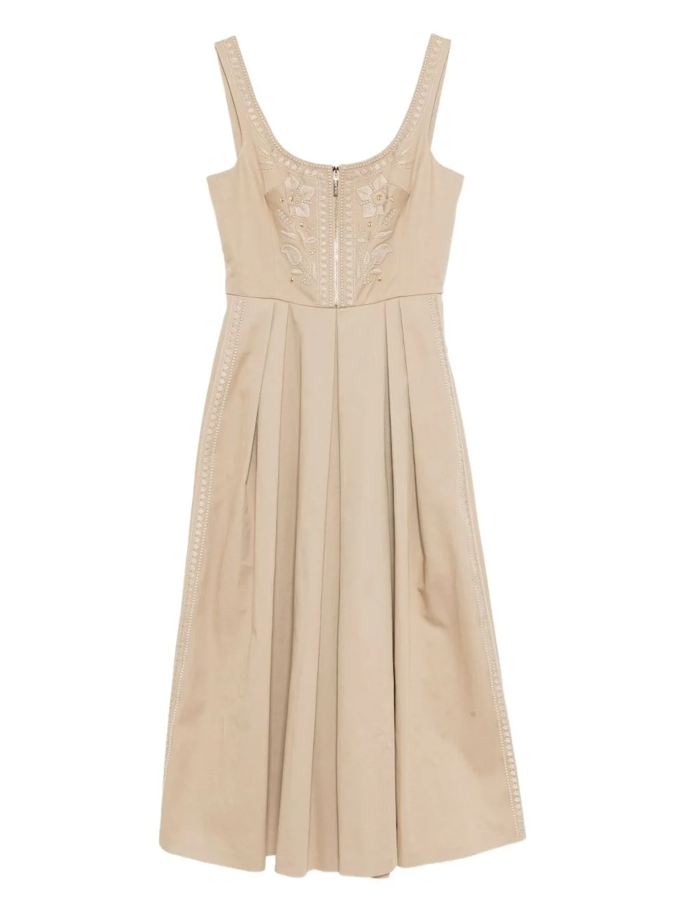 embroidered gabardine dress Highlights - Beige - Front zip fastening - Concealed rear hook and zip fastening - Sleeveless - Two side inset pockets Made in Italy Composition Organic Cotton 100% SIZE & FIT Model measurements Height 5 ft 10 in(1.78 m) Bust/Chest 29.92 in(76 cm) Hips 34.64 in(88 cm) Waist 24.8 in(63 cm) FittingInformation Designed for a close fit at the chest with a loose fit over the waist and hips Made from a midweight non-stretch fabric Washing instructions Dry Clean Only