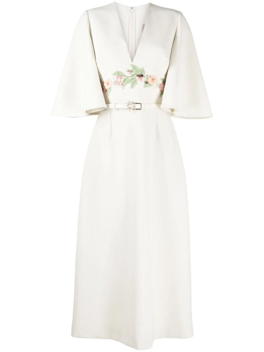 floral-applique midi dress Highlights - White - Silk blend - Floral embroidery - Plunging v-neck - Rear zip fastening - Short draped sleeves - Belted waist - A-line skirt - Straight hem - Mid-calf length Imported Composition Outer: Silk 50%, Polyester 46%, Elastane 4% Lining: Silk 100% SIZE & FIT Model measurements Height 5 ft 10 in(1.77 m) Bust/Chest 31.49 in(80 cm) Hips 35.43 in(90 cm) Waist 25.19 in(64 cm) FittingInformation Designed for a close fit at the chest and waist with a loose fit at the hip The belt offers adjustability for fitted preferences Made from a midweight stretch fabric, this piece offers elasticity and flexibility when worn This piece fits true to size – take your usual size Washing instructions Dry Clean Only