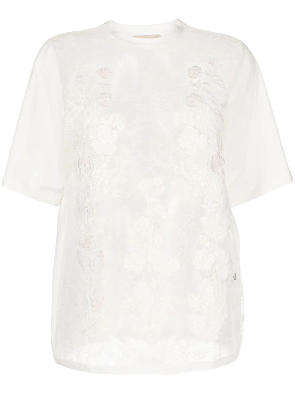floral-applique sheer T-shirt Highlights - Ivory white - Semi-sheer construction - Floral lace applique - Crew neck - Short sleeves - Straight hem Imported Composition Body: Polyester 57%, Nylon 32%, Rayon 7%, Spandex/Elastane 4% SIZE & FIT Model measurements Height 5 ft 9 in(1.76 m) Bust/Chest 31.1 in(79 cm) Hips 35.03 in(89 cm) Waist 24.4 in(62 cm) FittingInformation Designed to be unstructured, offering a loose fit throughout Made from a midweight stretch fabric, this piece offers elasticity and flexibility when worn This piece fits true to size – take your usual size