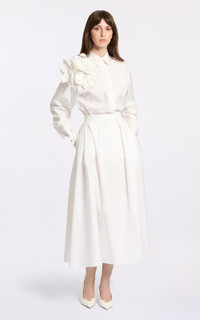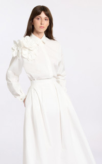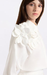 PRODUCT DETAILS - Resort '25 - Collared, long sleeve, relaxed fit, 3D floral detail at the shoulder - Unlined - Composition: Cotton Poplin - Color: off-white - Button fastening through front - Made in Lebanon