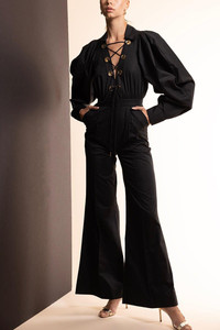 DETAILS AND INSIGHT Elie Saab heavy cotton jumpsuit in black. 65% Polyester, 35% Cotton Machine Wash Cold Made in Italy Style 13592